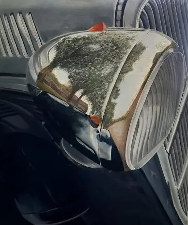 Stap binnen in een tijdloze ontmoeting tussen mens, machine en natuur. In Reflectie 1 reist je blik over het chromen oppervlak van een vintage koplamp, waar de rreflectie van omliggende bomen en een huis zich vervormen tot een dromerig landschap. Dit schilderij is een portret van nostalgie én van het voortdurende spel tussen realiteit en reflectie.